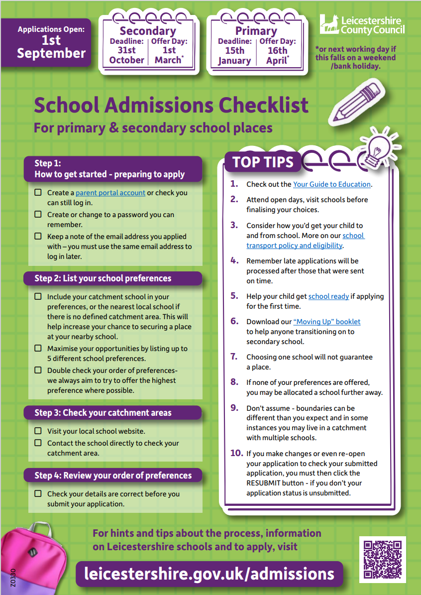First time admissions for new school starters must be made via the Leicestershire County Council website. Below is their checklist for 2026 applicants.